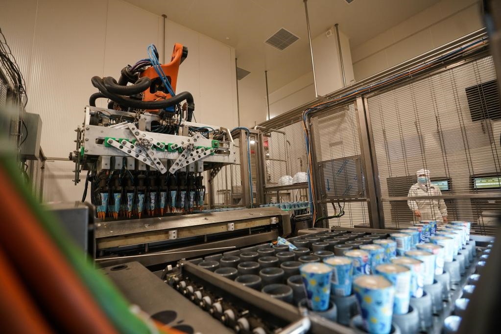 位于江蘇蘇州太倉的聯(lián)合利華和路雪生產(chǎn)基地,于2021年9月獲評全球“燈塔工廠”,成為當?shù)亍爸悄苤圃臁钡臉藯U。工廠里,機器人正將產(chǎn)品轉(zhuǎn)移到速凍隧道。新華社記者 季春鵬 攝