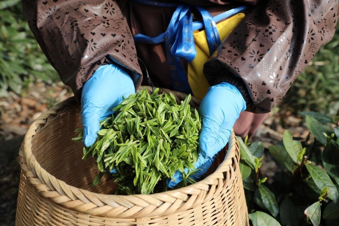 像林阿姨這樣熟練的采茶工,從早上七點多開始,一直采到下午五點,預計能采4斤鮮葉,約可產出1斤的干茶?!敖衲甑牟枞~賣相好、顏色正、大小均勻。你看這葉片多漂亮!”林阿姨一邊說著一邊低頭忙碌。