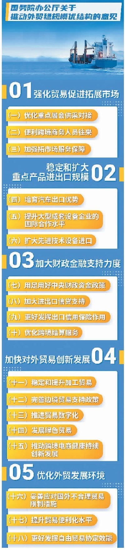 為推動外貿(mào)穩(wěn)規(guī)模優(yōu)結構,在前期已出臺多輪政策舉措的基礎上,國務院辦公廳4月25日對外發(fā)布《關于推動外貿(mào)穩(wěn)規(guī)模優(yōu)結構的意見》(以下簡稱《意見》),推出新一輪措施。專家認為,此次提出的18條具體措施既涉及重點產(chǎn)品,也關乎市場拓展和貿(mào)易創(chuàng)新,具有很強的針對性和操作性,有助于穩(wěn)住外貿(mào)規(guī)模,并在此基礎上進一步優(yōu)化外貿(mào)結構,推動實現(xiàn)全年進出口促穩(wěn)提質(zhì)目標任務。