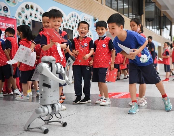 在湖南長(zhǎng)沙華夏實(shí)驗(yàn)學(xué)校舉辦“科技大篷車”進(jìn)校園活動(dòng)上,學(xué)生們?cè)诤蜋C(jī)器狗互動(dòng)(2022年6月22日攝)。新華社記者 薛宇舸 攝