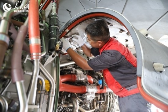 技術(shù)人員對飛機進行維修。 人民網(wǎng)記者 孟凡盛攝