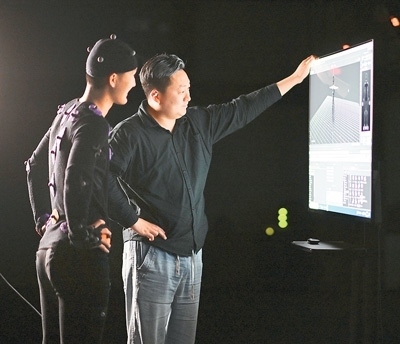 4月30日,在天津市濱海新區(qū)國家動(dòng)漫園里的大型動(dòng)作捕捉棚內(nèi),身著特定裝備的動(dòng)捕演員(左)和同事在查看電腦生成的虛擬角色動(dòng)作。新華社記者 趙子碩攝
