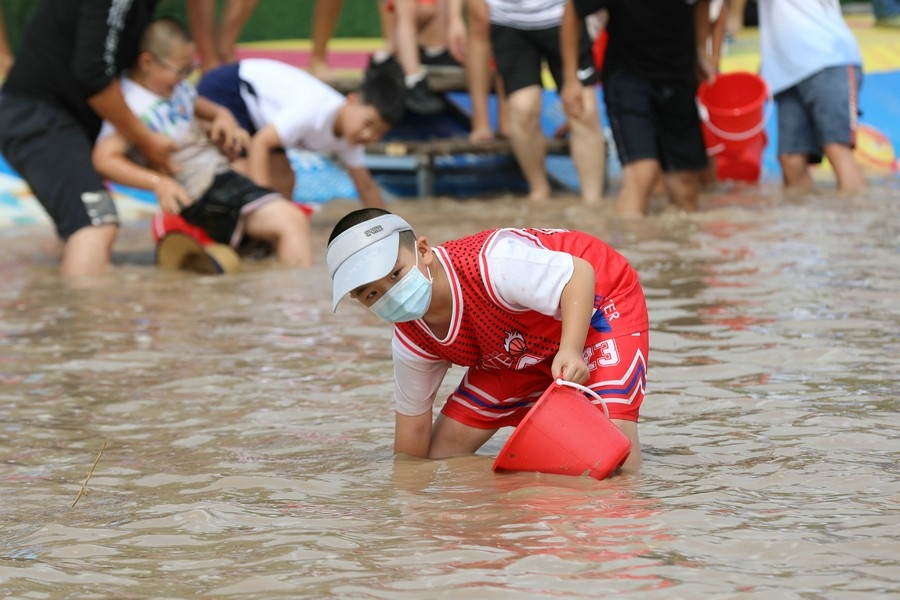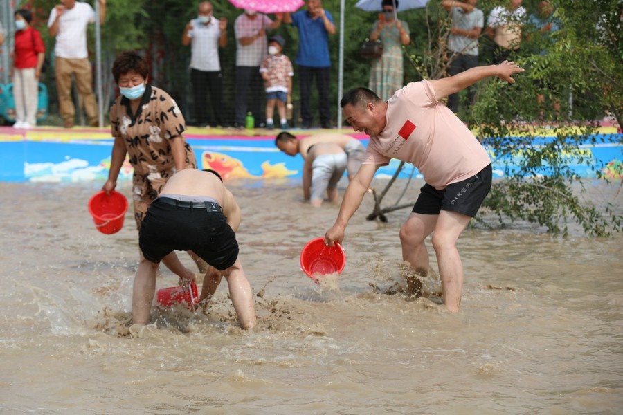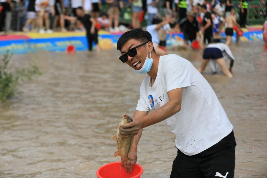 隨著主持人的一聲號(hào)令,來自呼和浩特市區(qū)和土默特左旗的眾多參與者,挽起褲管,光著腳丫,沖進(jìn)池塘,展開了一場(chǎng)摸魚大比拼。