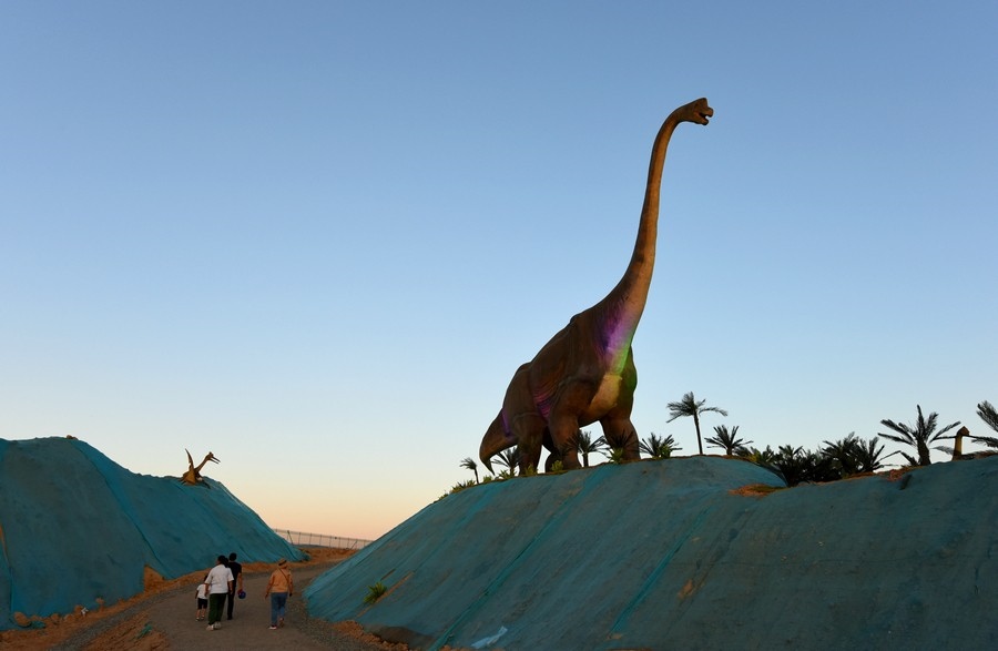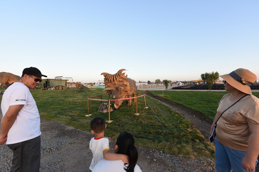 游客從高25米的亞洲最大的三條恐龍之一腳下經(jīng)過 記者 張楊攝影