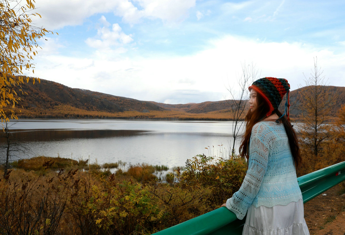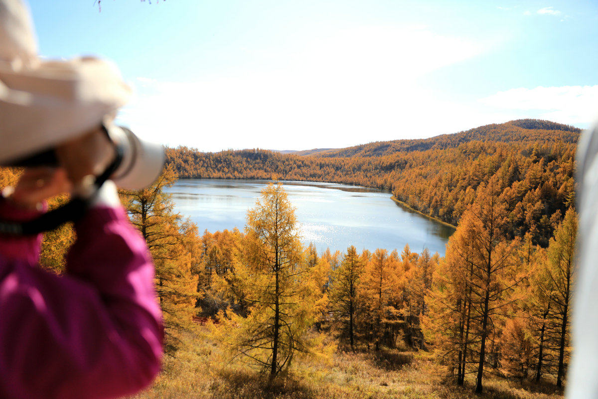 9月29日,游客在內(nèi)蒙古阿爾山國家森林公園烏蘇浪子湖邊打卡 北疆新聞?dòng)浾?張楊攝影