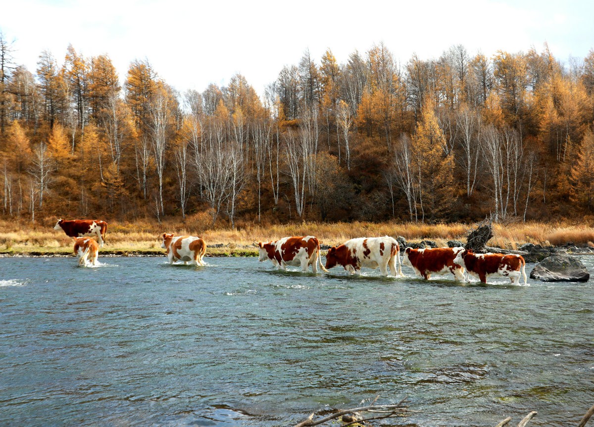 9月29日,內(nèi)蒙古阿爾山國家森林公園一群牛蹚過不凍河 北疆新聞?dòng)浾?張楊攝影