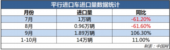 除了新能源汽車進(jìn)口量增長,平行進(jìn)口車也成為了一大亮點(diǎn)。根據(jù)數(shù)據(jù)顯示,今年7、8月份,我國平行進(jìn)口車在進(jìn)口車市場中成績還屬較差。其中,7月份平行進(jìn)口車進(jìn)口量約為1萬輛,同比下滑了61.2%;8月份平行進(jìn)口車進(jìn)口量也不理想,僅有9600輛,同比下滑了61.6%。但就在9月份,平行進(jìn)口車數(shù)量則出現(xiàn)了大幅攀升。根據(jù)國機(jī)汽車數(shù)據(jù)統(tǒng)計(jì),9月份我國平行進(jìn)口汽車進(jìn)口量約為1.89萬輛,同比大增106.3%。今年1-10月,平行進(jìn)口車數(shù)量共14.0萬輛,同比上漲了11.0%,占進(jìn)口總量的16%。詳情見下表: