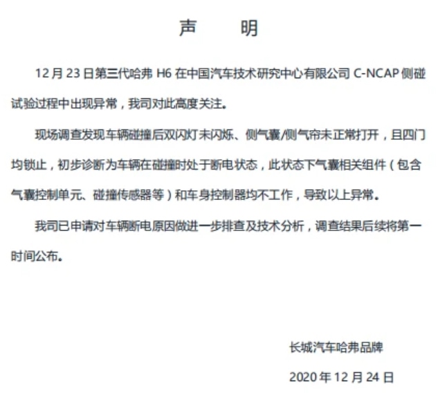 針對此碰撞結果,長城汽車給出了官方聲明,稱初步診斷為車輛在碰撞時處于斷電狀態(tài),導致以上異常。具體內(nèi)容如下: