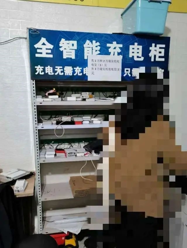 在李紅所提供的經(jīng)營(yíng)性站點(diǎn)充電柜的照片中,記者看到,五層的充電柜里,上面三層密密麻麻擺放著各種充電寶及手機(jī),在充電柜頂部貼有“全智能充電柜”字樣。