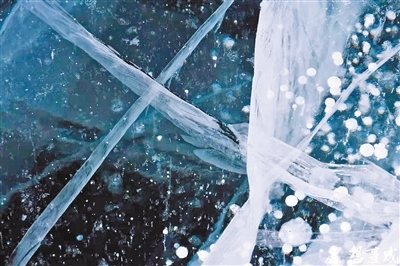 冰塊在夕陽霞光的照耀下,變身冬日瑪瑙,晶瑩剔透,溢光流彩。潔凈的冰面像龜背一樣裂出美麗的紋理,與夜晚琥珀色的天空相映成趣,令人眩目,美妙無比?!∴崗V鑫 攝