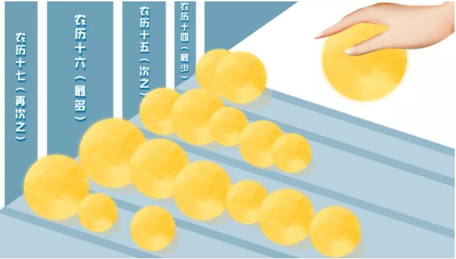 統(tǒng)計(jì)發(fā)現(xiàn),“滿(mǎn)月”出現(xiàn)次數(shù)最多的是農(nóng)歷十六,其次是農(nóng)歷十五,再次是農(nóng)歷十七,最少的是農(nóng)歷十四。