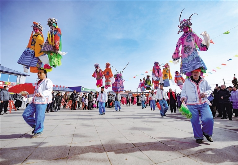 2月14日,在呼和浩特市土左旗畢克齊鎮(zhèn)臘鋪村文化廣場(chǎng)上,秧歌扭起來(lái),鑼鼓敲起來(lái),腦閣也款款擺起來(lái)。腦閣是國(guó)家級(jí)非物質(zhì)文化遺產(chǎn),扛閣的人在行走中踏著鼓點(diǎn),通過(guò)身體搖動(dòng)帶動(dòng)架子上的孩子擺起來(lái),極具觀賞性。(記者 鄭學(xué)良 通訊員 楊鑫 )