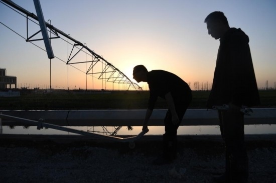 3月14日,在西平縣老王坡高標(biāo)準(zhǔn)農(nóng)田示范區(qū),劉亞輝(左)在調(diào)整噴灌機(jī)的移動(dòng)方向。