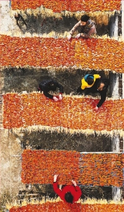 2022年12月16日,湖南省永州市新田縣枧頭鎮(zhèn)大觀(guān)堡村,村民在晾曬紅薯干。近年來(lái),該縣利用訂單服務(wù)和農(nóng)村電商平臺(tái),實(shí)現(xiàn)農(nóng)產(chǎn)品線(xiàn)上線(xiàn)下銷(xiāo)售。 劉貴雄攝(人民視覺(jué))