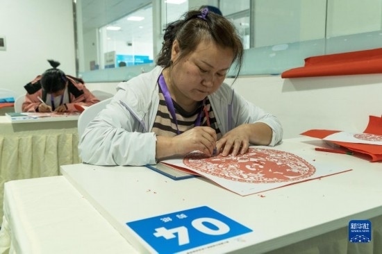 4月12日,在四川省綿陽市公共實訓基地,參加剪紙項目的選手正在比賽中。