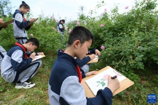 4月20日,埭溪鎮(zhèn)上強中學(xué)的學(xué)生在玫瑰莊園寫生。