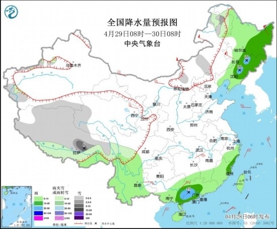 4月29日08時至30日08時,內(nèi)蒙古東北部、新疆南疆盆地西部、西藏大部、青海西部、川西高原南部等地部分地區(qū)有小雪或雨夾雪,其中,西藏東南部等地部分地區(qū)有中到大雪(5~8毫米)。東北地區(qū)大部、江南東部和南部、華南大部、臺灣島等地部分地區(qū)有小到中雨,其中,吉林東部、遼寧北部、廣西東部、廣東中西部等地部分地區(qū)有大雨(25~45毫米)。內(nèi)蒙古中北部、黑龍江東北部、青海東部、江西北部、貴州西南部、廣西東北部等地部分地區(qū)有4~6級風(fēng)。