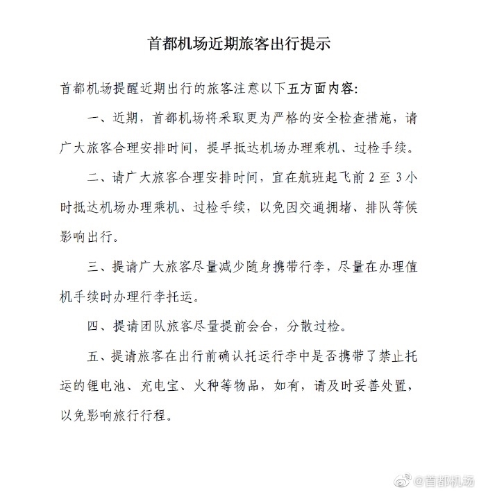央視網(wǎng)消息:5月16日,@首都機場 官方微博發(fā)布提示:首都機場近期將采取更為嚴格的安全檢查措施,請廣大旅客合理安排時間,提早抵達機場辦理乘機、過檢手續(xù)。