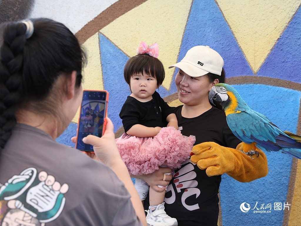 5月18日,雄安郊野公園辛瑪森林動物樂園內(nèi),家長帶著孩子正與表演動物互動。人民網(wǎng) 李兆民攝