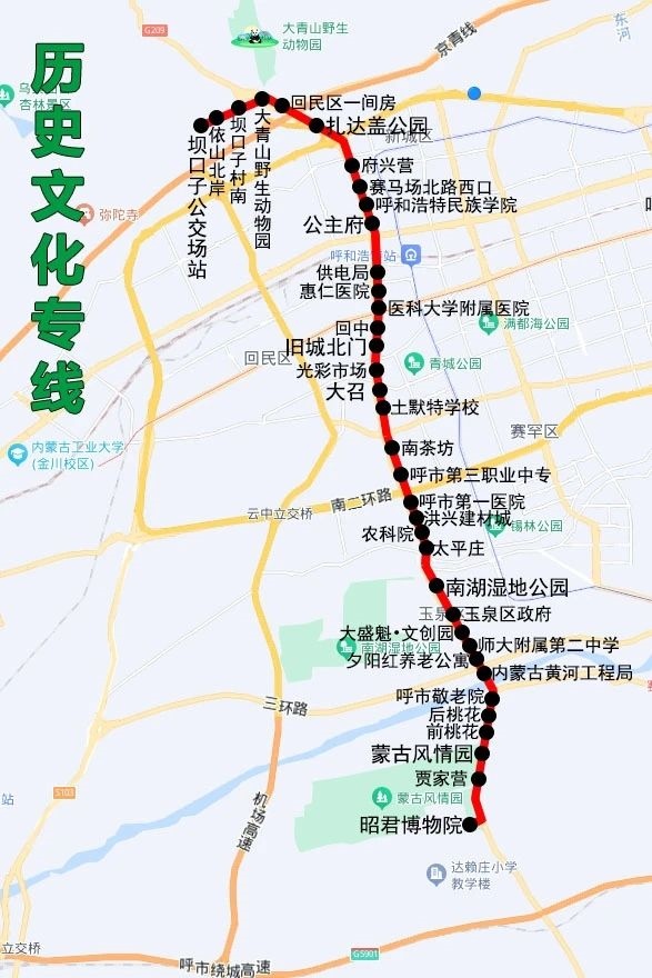 沿途設站:壩口子公交場站、依山北岸、壩口子村南、大青山野生動物園、回民區(qū)一間房、扎達蓋公園、府興營、賽馬場北路西口、呼和浩特民族學院、公主府、供電局、匯仁醫(yī)院、醫(yī)科大學附屬醫(yī)院、回中、舊城北門、光彩市場、大召、土默特學校、南茶坊、呼市第三職業(yè)中學、呼市第一醫(yī)院、洪興建材城、農科院、太平莊、南湖濕地公園、玉泉區(qū)政府、大盛魁文創(chuàng)園、師大附屬第二中學、夕陽紅養(yǎng)老公寓、內蒙古黃河工程局、呼市敬老院、后桃花、前桃花、蒙古風情園、賈家營、昭君博物院。