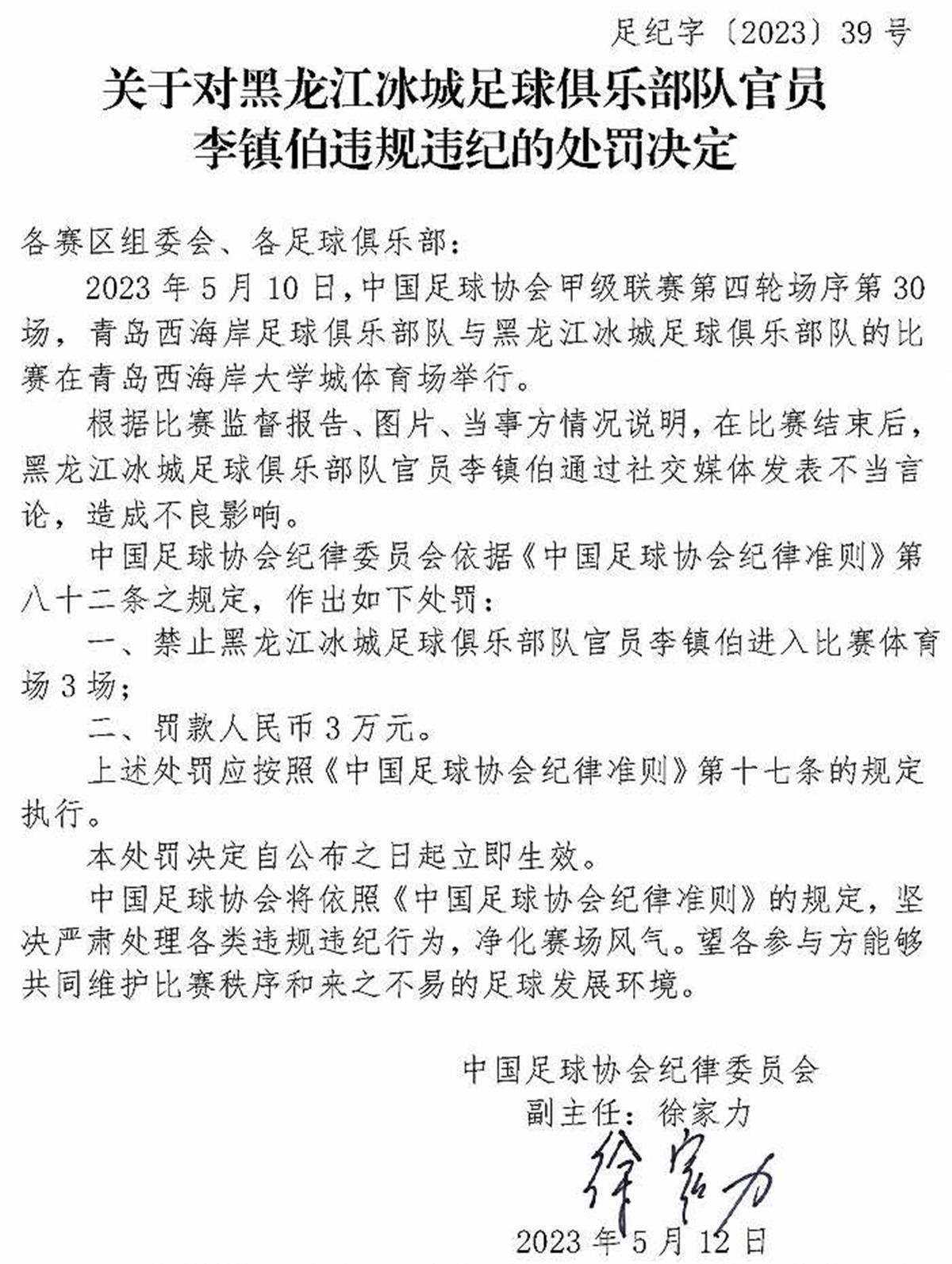 中國足協(xié)紀律委員會根據(jù)裁判員報告、比賽監(jiān)督報告、視頻、當事方情況說明及聽證,認定楊帆實施暴力行為,于是依據(jù)《中國足球協(xié)會紀律準則》第五十三條、第四十八條之規(guī)定,對他給予停賽4場、罰款人民幣4萬元的處罰。在這張罰單上,第一次出現(xiàn)了徐家力的名字。從這張罰單來看,中國足協(xié)紀律委員會定下了基調,那就是嚴厲打擊球場暴力行為。