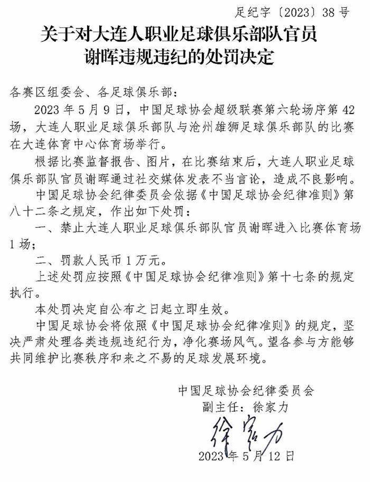 5月12日,中國足協(xié)紀律委員會接連開出三張罰單,對中超大連人隊的主教練謝暉,以及南通支云隊、黑龍江冰城隊的兩位俱樂部官員范兵和李鎮(zhèn)伯進行了處罰,共計罰款5萬元,并對三人追加禁賽。這三張罰單一出,引來外界的一片質疑聲。