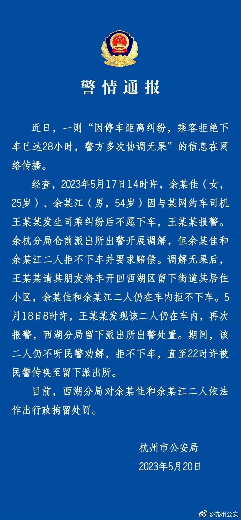 近日,杭州一名網(wǎng)約車司機(jī)稱,因兩名乘客打車點(diǎn)不能停車,商議在距離上車地點(diǎn)20米處等乘客。乘客上車后對司機(jī)大吼大叫,司機(jī)決定取消訂單。但上述乘客卻“賴”在網(wǎng)約車上拒絕下車,時(shí)間超過24小時(shí)。沖突期間警方曾前來調(diào)解,但勸說未果。5月20日,杭州公安通報(bào),兩名乘客被行政拘留7日。