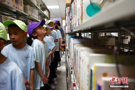 圖為一個(gè)藏族女孩抬頭望向書(shū)架。富田攝