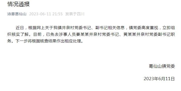 ·官方通報村副書記出軌村書記:涉事2人被免職。