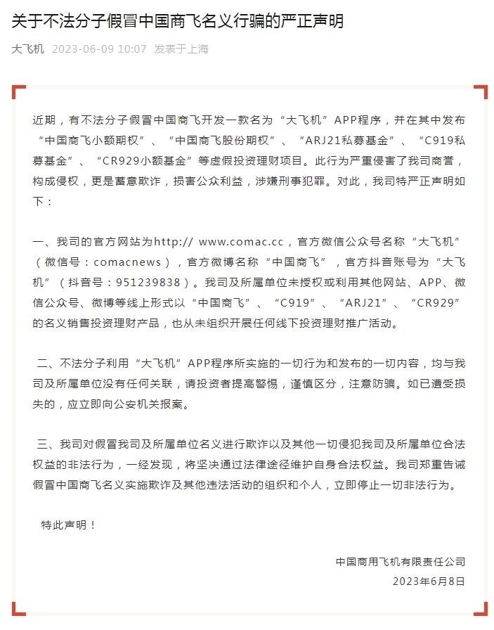 另據(jù)“大飛機”微信公眾號6月9日發(fā)布的《關(guān)于不法分子假冒中國商飛名義行騙的嚴正聲明》,有不法分子假冒中國商飛開發(fā)一款名為“大飛機”APP程序,并在其中發(fā)布“中國商飛小額期權(quán)”、“中國商飛股份期權(quán)”、“ARJ21私募基金”、“C919私募基金”、“CR929小額基金”等虛假投資理財項目。