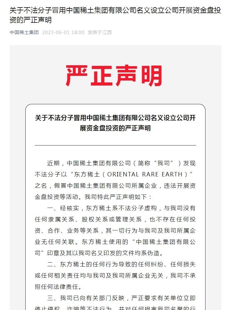 “中國稀土集團”微信公眾號曾在6月1日發(fā)布嚴正聲明提醒,近期,中國稀土集團有限公司(下稱“中國稀土”)發(fā)現(xiàn)不法分子以“東方稀土(ORIENTAL RARE EARTH)”之名,假冒中國稀土集團有限公司所屬企業(yè),違法開展資金盤投資等活動。