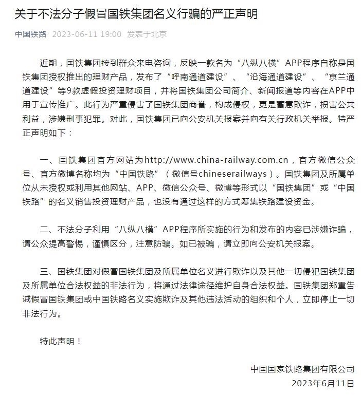 “中國鐵路”微信公眾號6月11日發(fā)布嚴正聲明稱,近期,國鐵集團接到群眾來電咨詢,反映一款名為“八縱八橫”APP程序自稱是國鐵集團授權(quán)推出的理財產(chǎn)品,發(fā)布了“呼南通道建設(shè)”、“沿海通道建設(shè)”、“京蘭通道建設(shè)”等9款虛假投資理財項目,并將國鐵集團公司簡介、新聞報道等內(nèi)容在APP中用于宣傳推廣。