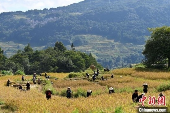 23日,正值秋分時(shí)節(jié),也是第六個(gè)中國(guó)農(nóng)民豐收節(jié),哈尼梯田染上了豐收的色彩。哈尼人民在金黃的稻田里割水稻、捉稻花魚,與四方賓客共慶豐收。為了慶祝豐收,當(dāng)?shù)剡€舉行了大型稻作農(nóng)耕實(shí)景表演。身著民族服飾的哈尼族民眾站在田埂上,以稻田為舞臺(tái),以大地山川為背景,唱起悠揚(yáng)的哈尼古歌,手捧水稻,載歌載舞,表達(dá)崇尚自然、感恩自然之情。