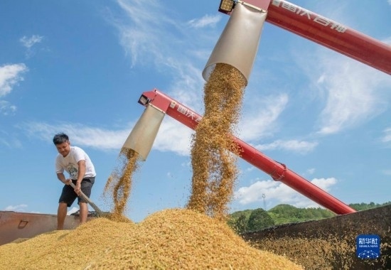 7月10日,在湖南省永州市道縣四馬橋鎮(zhèn)金獅庵村,農(nóng)民把收割的早稻裝車(chē)。