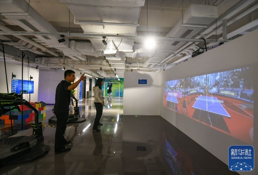 ↑?7月13日,在成都大運(yùn)會主媒體中心的休閑娛樂區(qū),兩名媒體記者在體驗(yàn)互動投影乒乓球。新華社記者 王曦 攝