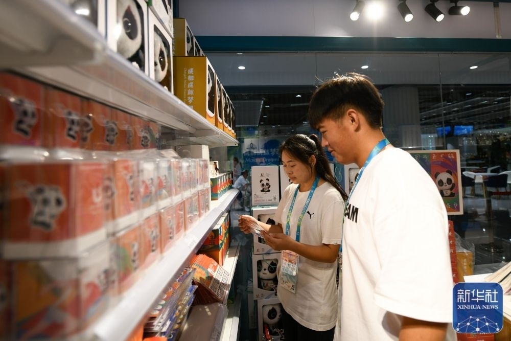 ↑7月14日,媒體工作人員在成都大運(yùn)會主媒體中心大運(yùn)會官方特許商品零售店內(nèi)選購紀(jì)念品。新華社記者 胥冰潔 攝