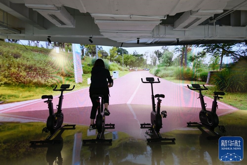 ↑7月14日,媒體工作人員在成都大運(yùn)會主媒體中心休閑娛樂區(qū)內(nèi)體驗(yàn)騎行。新華社記者 胥冰潔 攝