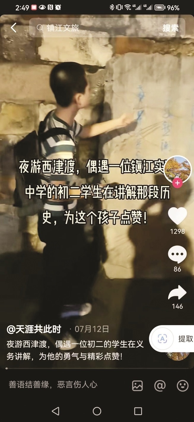 揚子晚報訊(記者 萬凌云 通訊員 湯婉蓉 孫冬)“人類的歷史與功績會隨著時間而消失。但是中國將在他們身上繼續(xù)存在,我們將保持他們高舉的旗幟……”7月22日,一段鎮(zhèn)江初中學生講解歷史的視頻爆火,他們的講解地位于歷史底蘊深厚的鎮(zhèn)江西津渡景區(qū)。