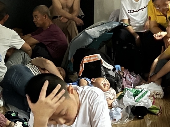 汗味兒、腳臭味兒、霉味兒攪和在一起,溫宇被“熏得頭暈”。室內(nèi)的椅子被搶占一空,講演臺(tái)上睡滿了打地鋪的乘客。幾乎所有人都表情木然,“累得不想說話”。