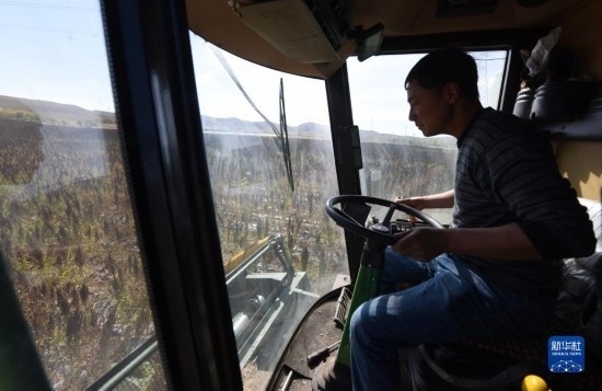 10月1日,在沽源縣白土窯鄉(xiāng)小西溝村,當?shù)剞r機手在操作收割機收獲藜麥。
