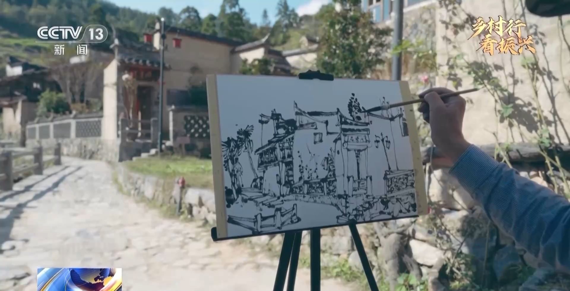 總臺記者 林姍蓉:這里就是龍?zhí)洞?。沿著溪水一路往下,你可以看到兩岸都是這種高低錯落的土夯的民居。這個季節(jié)柿子都熟了,到處都可以看到村民曬柿餅、曬稻谷,黃綠交錯的,非常好看。來到龍?zhí)?,還有一點(diǎn)非常讓我印象深刻,就是在這里每走幾步,我都可以看到一個正在寫生創(chuàng)作的藝術(shù)家。