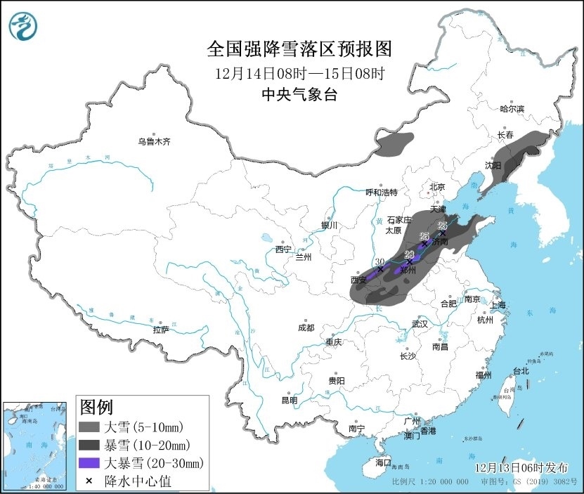 12月14日08時(shí)至12月15日08時(shí),陜西東南部、湖北西北部、河南中西部和北部、山西南部、河北南部、山東大部、遼寧東部、吉林東部以及內(nèi)蒙古中部等地的部分地區(qū)有大到暴雪,其中,陜西東南部、河南北部、山東西北部等地部分地區(qū)有大暴雪(20~30毫米)。上述部分地區(qū)新增積雪深度8~12厘米,局地可達(dá)15-20厘米以上。