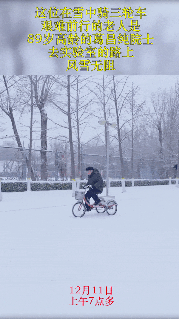 近日,早上7點(diǎn)多,北京降雪后,在北京科技大學(xué)的校園內(nèi),拍到感人一幕。茫茫白雪中,一位老人吃力地蹬著三輪車緩緩地前進(jìn),風(fēng)雪無阻。老人是89歲的葛昌純院士,這天早晨,他正騎車前往實(shí)驗(yàn)室,而騎著三輪車去實(shí)驗(yàn)室,是葛老幾十年如一日的堅(jiān)持。葛昌純院士是著名核材料、粉末冶金以及先進(jìn)陶瓷專家,是我國“核工業(yè)功勛”人物,為“兩彈一星”事業(yè)作出了重要貢獻(xiàn)。