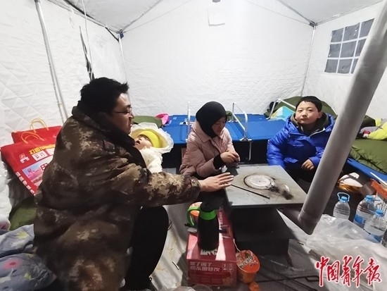 12月19日晚,甘肅省積石山縣大河家鎮(zhèn)一處安置點(diǎn),30歲的馬繼云一家在安置點(diǎn)帳篷里烤火爐。當(dāng)天他們收到了政府和愛(ài)心企業(yè)提供的生活物資,把一家人的生活安頓了下來(lái)。中青報(bào)·中青網(wǎng)記者 馬富春/攝