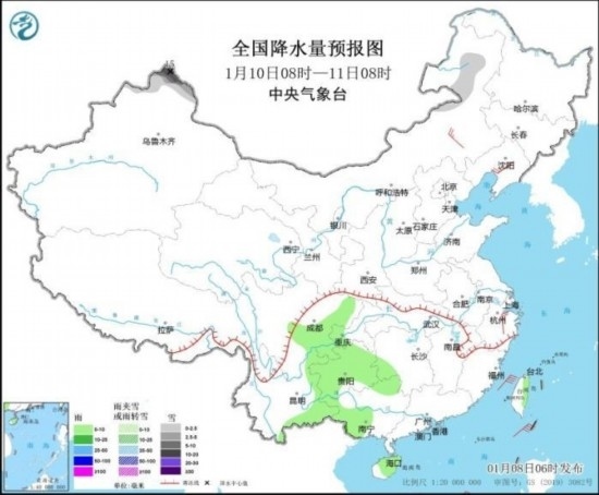 全國降水量預(yù)報(bào)圖(1月9日08時(shí)-10日08時(shí)) 來源:中央氣象臺網(wǎng)站