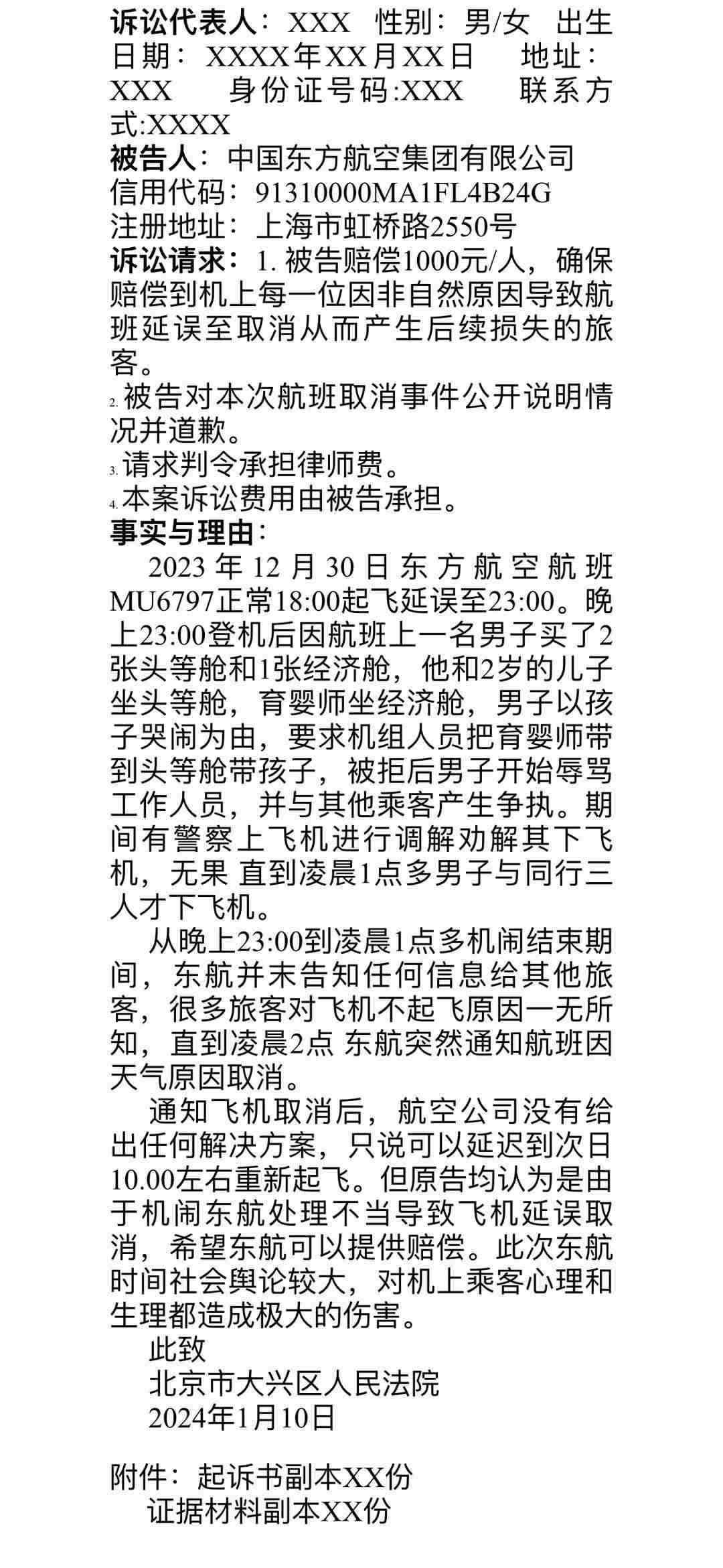 群內(nèi)發(fā)出的起訴書寫道:“從當(dāng)日23點(diǎn)到次日凌晨1點(diǎn)多機(jī)鬧結(jié)束期間,東航并未告知任何信息給其他旅客,很多旅客對(duì)飛機(jī)不起飛原因一無(wú)所知,直到凌晨2點(diǎn),東航突然通知航班因天氣原因取消。通知飛機(jī)取消后,航空公司沒有給出任何解決方案,只說可以延遲到次日10點(diǎn)左右重新起飛。但原告均認(rèn)為是由于機(jī)鬧,東航處理不當(dāng),導(dǎo)致飛機(jī)延誤取消,希望東航可以提供賠償。此次東航事件社會(huì)輿論較大,對(duì)機(jī)上乘客心理和生理都造成極大的傷害?!睋?jù)悉,乘客們擬起訴至北京市大興區(qū)人民法院。