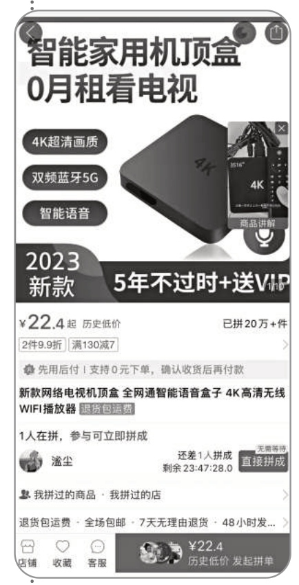 “0月租看電視”“這是一款可以讓你一輩子不用交有線電視費(fèi)的機(jī)頂盒”……在電商平臺(tái)上,一款網(wǎng)絡(luò)電視機(jī)頂盒各型號(hào)版本已售出超過(guò)20萬(wàn)件,在同類商品中銷售量最高。記者購(gòu)買了一款售價(jià)47.88元的型號(hào),套裝內(nèi)包括機(jī)頂盒、配件以及永久會(huì)員。