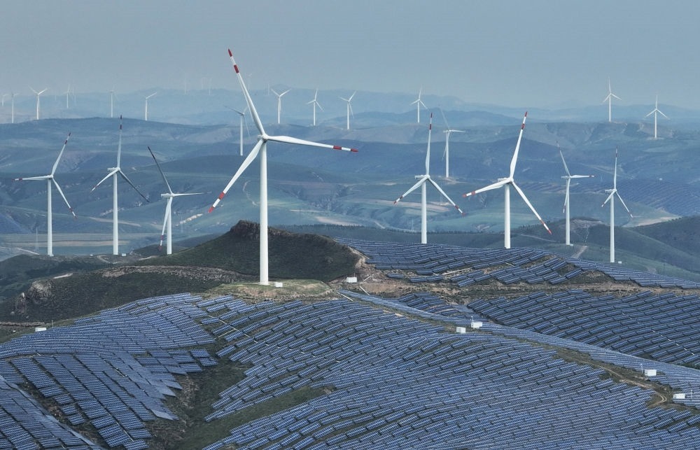 這是2023年9月2日拍攝的承德市豐寧滿(mǎn)族自治縣萬(wàn)勝永鄉(xiāng)萬(wàn)勝永村附近的一處風(fēng)光互補(bǔ)發(fā)電場(chǎng)(無(wú)人機(jī)照片)。新華社記者楊世堯 攝