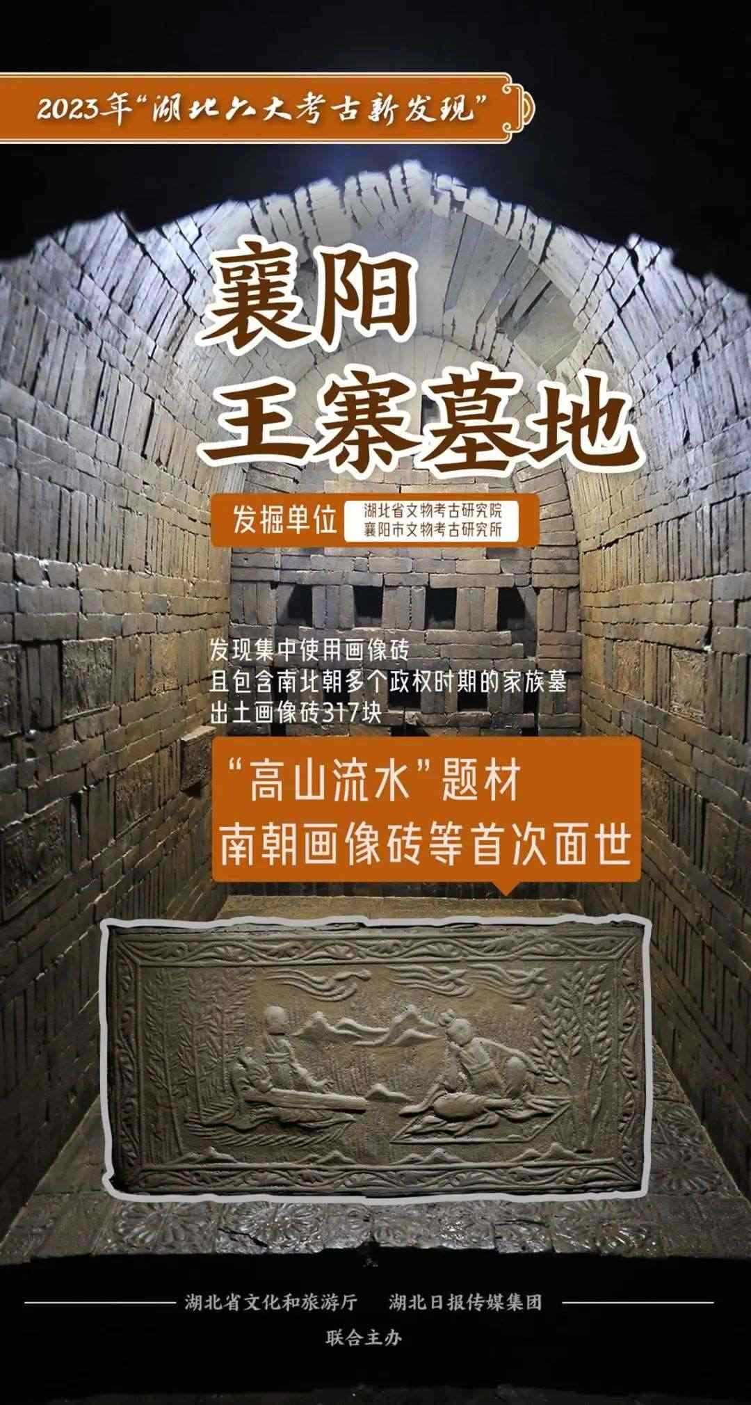 襄陽王寨墓地,發(fā)現(xiàn)一處集中使用畫像磚且年代跨越南、北朝多個(gè)政權(quán)時(shí)期的家族墓,其中7座墓葬出土畫像磚共計(jì)317塊,涉及19種不同圖案。首次發(fā)現(xiàn)“高山流水”題材以及“五音直郎”“小輿大駕行”“牽誕馬”榜題的畫像磚。