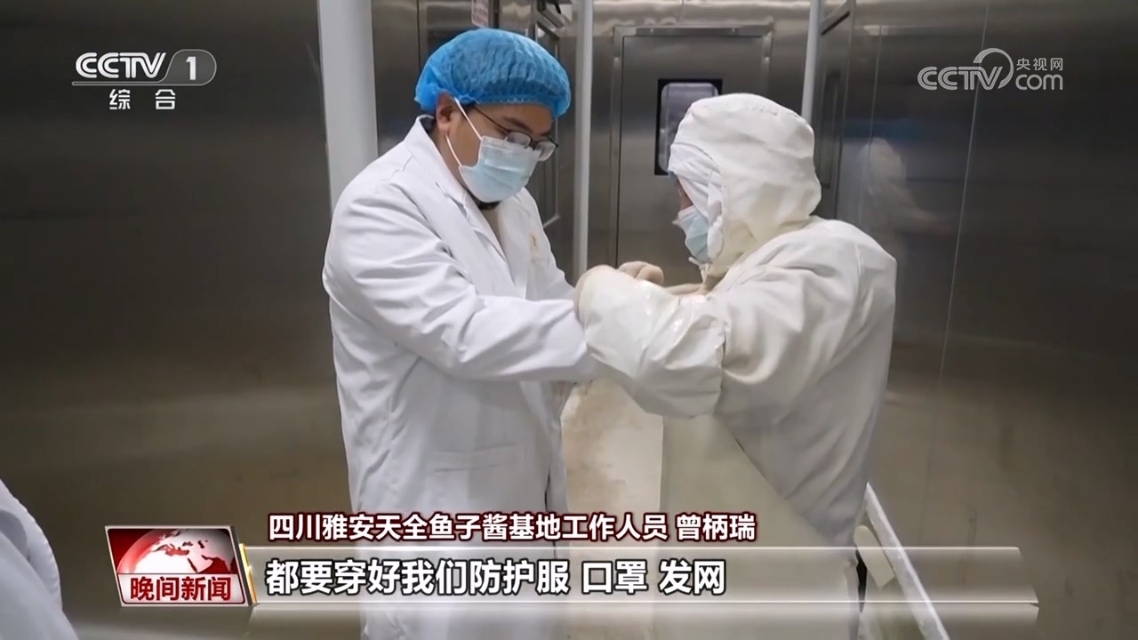 四川雅安天全魚子醬基地工作人員 曾柄瑞:每次進加工車間都要穿好防護服、口罩、發(fā)網,就像進手術室一樣,經過非常嚴格的消毒程序和控制,才能夠進入加工車間。